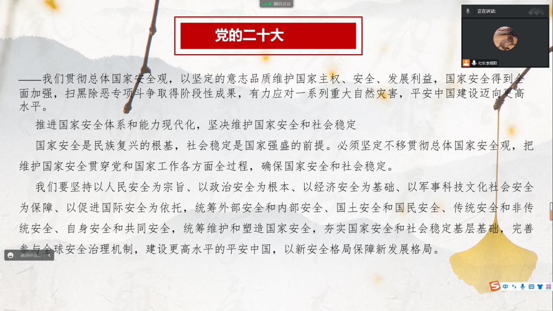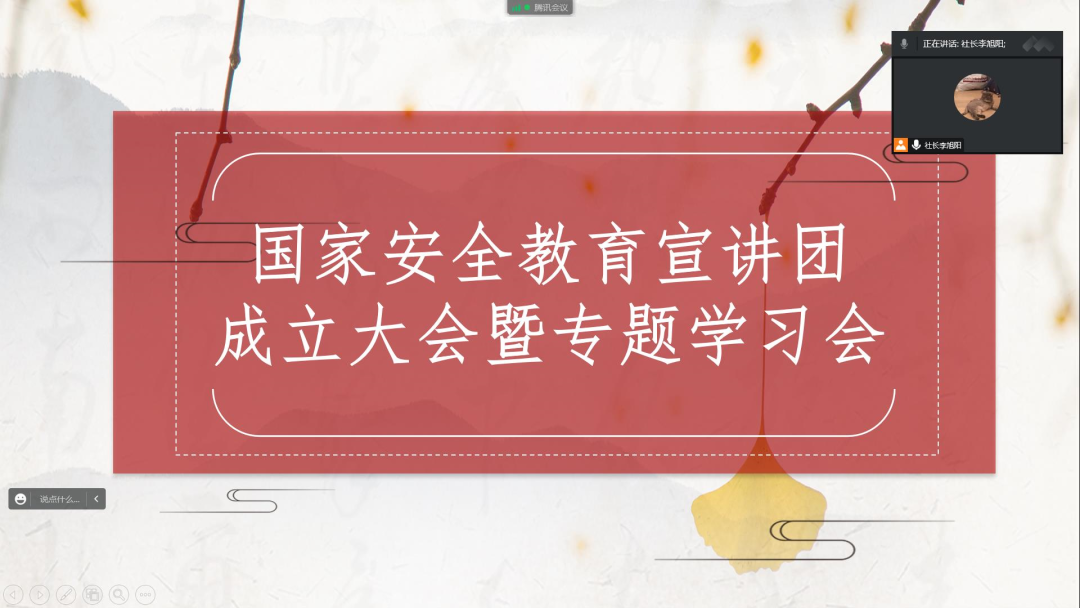 2022年11月1日晚,伟德victor1946国家安全教育宣讲团成立大会暨党的二十大精神专题学习会在线上召开。宣讲团全体成员参加本次会议,社长李旭阳同学主持会议。