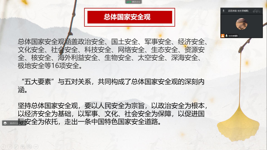 紧接着,李旭阳同学就总体国家安全观相关内容给宣讲团的成员做了业务培训。他讲到维护国家安全我们要坚持总体国家安全观,总体国家安全观包括政治安全、国土安全、军事安全、经济安全、文化安全、社会安全、科技安全、网络安全、生态安全、资源安全、核安全、海外利益安全、生物安全、太空安全、深海安全、极地安全等16项安全,并且就“五大要素”与五对关系,做了简单的讲解。