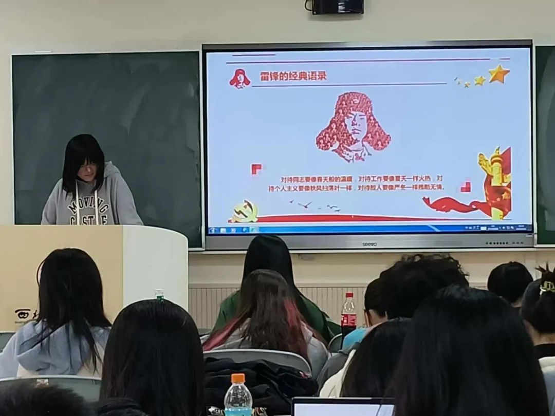 团支书于滢介绍了雷锋同志在新中国建立初期和社会主义建设初期无私奉献、舍己为人的伟大事迹,并着重介绍了雷锋精神的时代内涵,说明了雷锋精神既是马列主义时代精神的体现,又是对我党我军优良传统的继承和发扬,也是对中华民族传统美德的继承和升华,具有重要的时代价值。“奉献、友爱互助、进步”的志愿者精神,正是新时期雷锋精神的核心,是雷锋精神的时代性和先进性的具体体现。并表达出我们应该像雷锋那样,发扬“学而不厌,锲而不舍”的钉子精神,为了时代进步、发奋学习、永不懈怠的伟大志向。