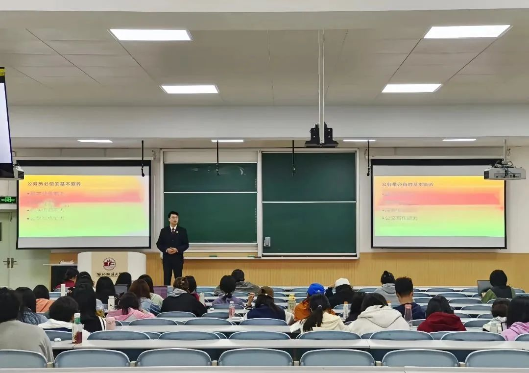 王梦伟从公务员必备的基本素质讲起,关于考公选岗,他表示,首先需要确定好自己想要去哪里,选择适合自己的单位,他对纪委监委、政法委、法院、检察院等分别进行了详细的介绍,分享最后,王梦伟分享了关于陕西检察的宣传视频并表示欢迎同学们的加入。