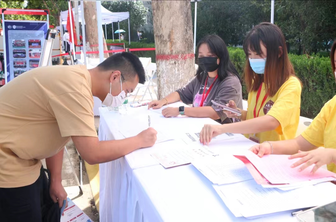 8点左右,新生们陆续来到公司摊位进行开学报道。扫描录取通知书后,新生们来到公司摊位。摊位上的学长学姐们为新生扫描通知书,发放校园卡和澡卡,他们仔细审查返校申请,提醒新生提交体温记录表和健康承诺书,严格执行校园防疫措施,为新生安全健康保驾护航。