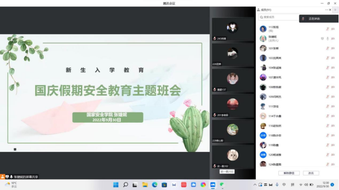 为进一步紧抓国庆假期安全教育和公司疫情防控工作,提高2022级新生的安全防范意识,筑牢安全防线,保障员工在国庆假期的安全,伟德国际victor1946于2022年9月30日中午,在腾讯会议召开2022级本科新生入学教育暨国庆假期安全教育主题班会。本次班会由伟德国际victor19462022级辅导员张婕妮老师主持,2022级全体新生参加。