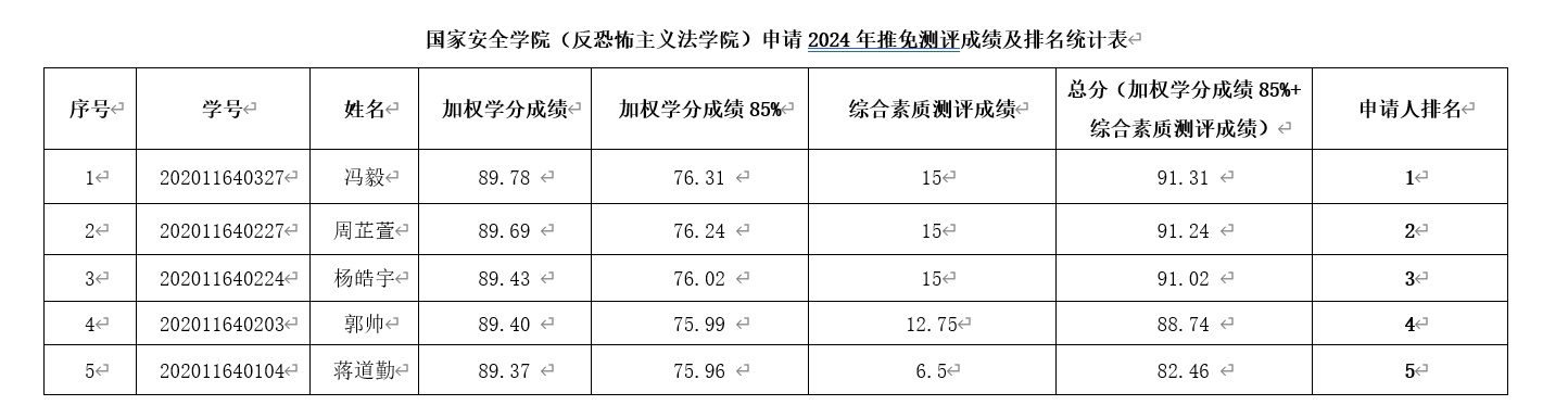 根据公司《关于开展2024年推免成绩测评工作的通知》,经过广泛动员宣传,员工自愿申请,公司于2023年9月7日组织公开答辩及评定。经公司推免生遴选工作小组会议审核,现将2024年推免测评成绩及排名进行公示: