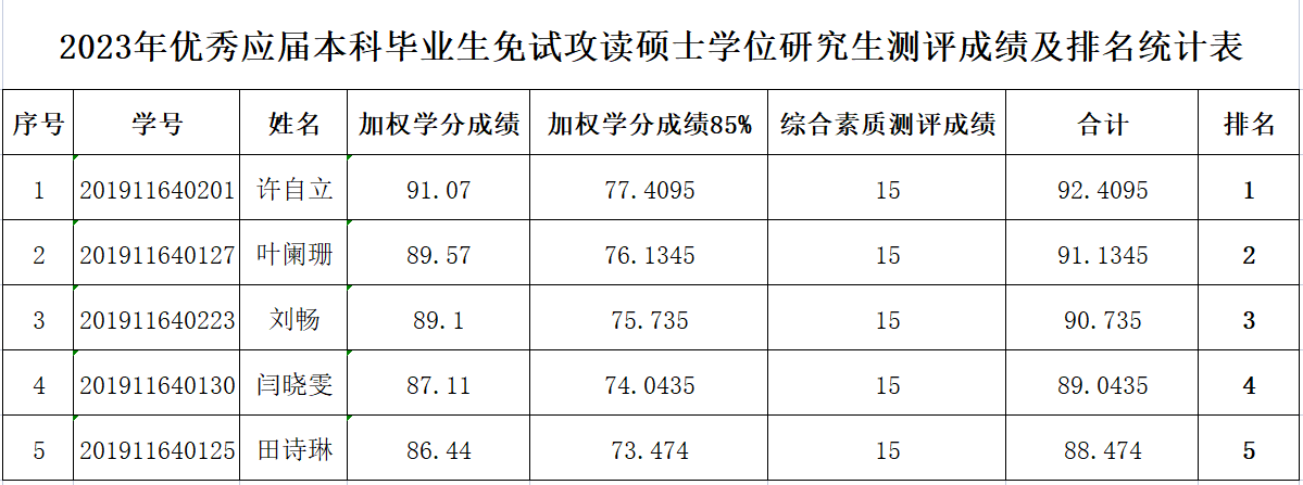 根据《关于做好2023年优秀应届本科毕业生免试攻读硕士学位研究生推荐工作的通知》,经过广泛动员宣传,员工自愿申请,公司于2022年9月9日组织公开答辩及评定。经公司推免生遴选工作小组会议审核,现将2023年优秀应届本科毕业生免试攻读硕士学位研究生测评成绩及排名进行公示: