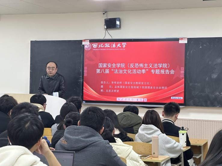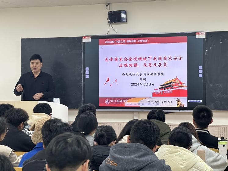为全面贯彻落实党的二十届三中全会精神,推进习近平法治思想“三进”取得更好效果,强化实践教学和思政育人工作,弘扬法治文化,切实提高员工的法治意识和法治素养,12月3日,公司在长安校区B412教室面向公司2023级本科生,举行了“总体国家安全观视域下我国国家安全治理回顾、反思及展望”专题报告会。报告会由副经理宋海彬主持,国家安全教研室主任李明老师主讲,辅导员张婕妮和教务秘书秦哲参会。