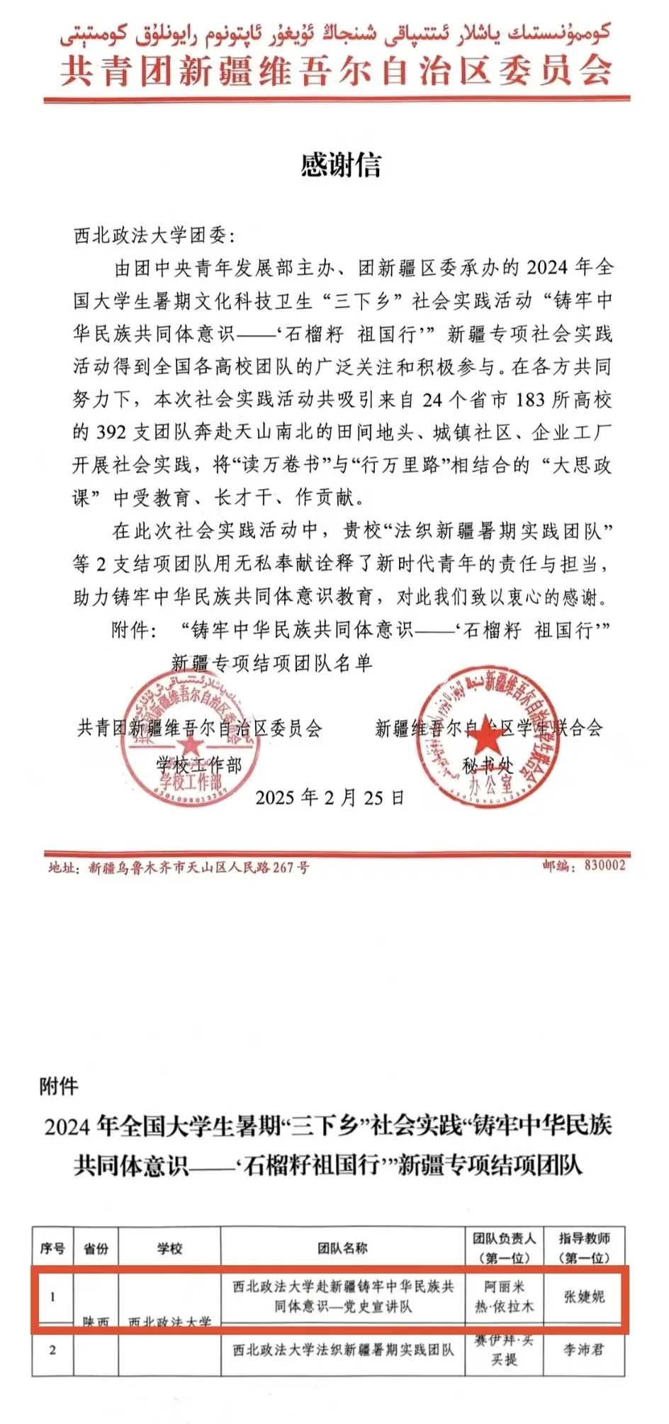 近日,共青团新疆维吾尔自治区委员会向公司团委发来感谢信,对伟德国际victor1946由张婕妮老师、王真老师指导的赴新疆铸牢中华民族共同体意识社会实践团队——党史宣讲队在2024年全国老员工暑期文化科技卫生“三下乡”社会实践活动“铸牢中华民族共同体意识——‘石榴籽 祖国行’”新疆专项社会实践活动中的突出表现予以表扬和感谢。