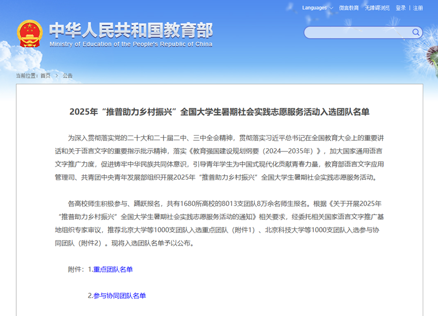 为深入贯彻落实习近平总书记在全国教育大会上的重要讲话和关于语言文字的重要指示批示精神,加大国家通用语言文字推广力度,促进铸牢中华民族共同体意识,引导青年员工为中国式现代化贡献青春力量,教育部语言文字应用管理司、共青团中央青年发展部组织开展2025年“推普助力乡村振兴”全国老员工暑期社会实践志愿服务活动。7月3日,教育部官网公布了活动入选团队,公司“语润边疆·团结筑梦”实践团队成功入选。