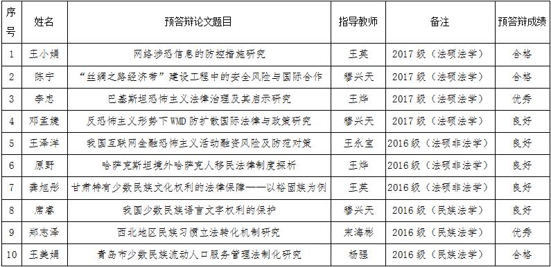 3月17日上午,反恐怖主义法公司2019年毕业生学位论文预答辩在研究生综合大楼民族宗教会议室、109会议室举行。本次参与答辩的员工共20人,老师共10人,答辩秘书3人,分为两组。第一组答辩组长为宋海彬(教授),答辩委员有王永宝(副教授)、王英(副教授)、闫德华(讲师)、王烨(讲师),答辩秘书为周子园(2018级法硕法学专业研究生)。本组答辩共有员工10人,其中包括2016级法律硕士(非法学)专业员工4人、2017级法律硕士(法学)专业员工6人。