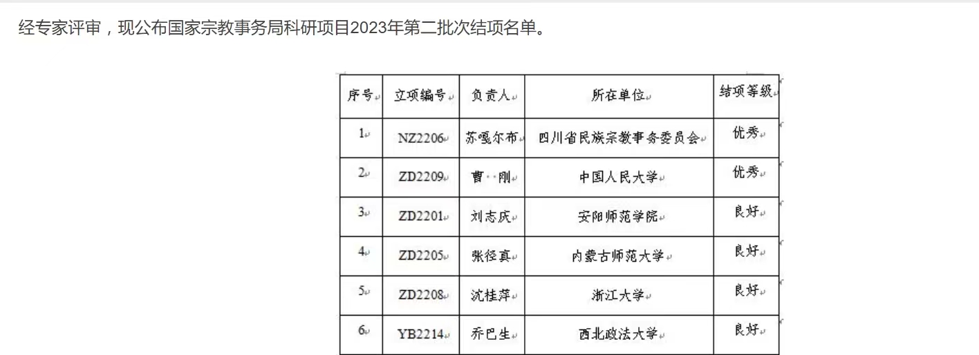 6月11日,中央统战部宗教研究中心公布国家宗教事务局科研项目2023年第二批次结项名单。公司乔巴生博士课题(课题编号:YB2214)顺利结项,结项等级为良好。