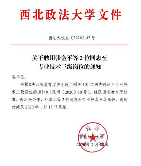 7月20日,经陕西省教育厅核准,聘用张金平、舒洪水等2位同志至专业技术三级岗位。聘用时间从2020年1月15日算起。